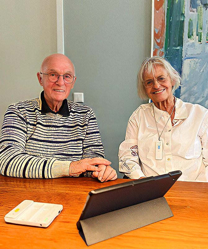 Bejaarde man en vrouw zitten aan tafel met een ipad voor hun